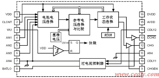 2.选择3或4节电池充电工作状态  当电池组为3节电池时,引脚2CLCNT应连到引脚16DVDD,同时将引脚6AN3与引脚7AN4连到一起,当电池组为4节电池时,引脚2CLCNT接地(即连到引脚7AN4),AN3引脚接至电池组最下面一只电池的正极。